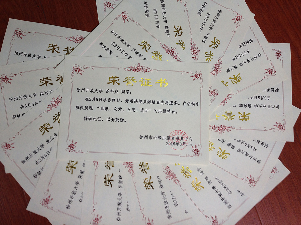 2016年3月學(xué)雷鋒活動日,我院“小水滴”服務(wù)隊與徐州市“心緣”志愿者協(xié)會共同舉行公益活動并取得圓滿成功。在這次活動中,“小水滴”服務(wù)隊14名隊員表現(xiàn)優(yōu)異,榮獲“優(yōu)秀志愿者”榮譽(yù)證書。