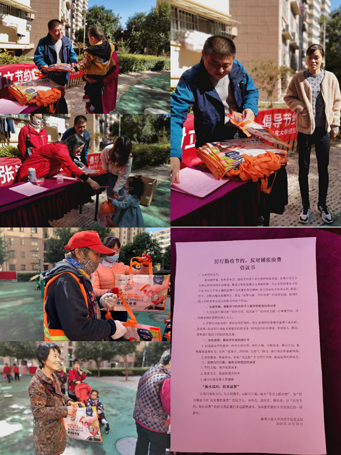 為深入貫徹落實習近平總書記對制止餐飲浪費行為作出的重要指示,切實培養(yǎng)節(jié)約習慣,營造“浪費可恥、節(jié)約光榮”的社會氛圍,10月23日上午,徐州開放大學經(jīng)貿(mào)學院黨支部走入銅山區(qū)學苑社區(qū),開展了“厲行勤儉節(jié)約,反對鋪張浪費”主題黨日活動。